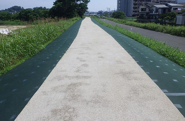 工事場所 熊本市北区清水町地内 除草工400m2 防草シート設置400m2 山砂舗装2400m2 熊本市北区にある坪井川遊水地の遊歩道について雑草繁茂による景観の悪化や防犯面での安全性の低下など問題が生じているので除草を行い防草対策として防草シートの設置、遊歩道には凸凹が多数ある為、新たに山砂を敷き遊歩道の整備を行った。Tere were problems with the promenade, such as the deterioration of the scenery due to weeds and a decline in safety from a crime prevention perspective. Therefore, we removed weeds and installed weed control sheets to promenade had many uneven surfaces, we laid new mountain sand and prepared the promenade.